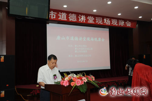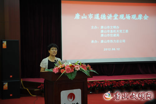 观摩活动分三部分进行。第一部分由市文明办副主任黄明洛主持。与会人员观看了市热力总公司道德建设专题片《以道德的力量创新供热发展》,听取了市热力总公司道德讲堂建设情况介绍;市委宣传部副部长、文明办主任郭彦徽就全市的道德讲堂建设讲了重要意见。第二部分集中观摩了市热力总公司道德讲堂"5+N"活动流程。向大家精彩展示了道德讲堂"五个一"活动规定流程:唱一首爱国歌曲,大家齐声演唱了《歌唱祖国》;看一部道德短片,共同观看了唐山市道德模范孙东旺的事迹短片;诵一段国学经典,齐声诵读了国学经典《大学》片段;讲一个身边的道德故事。大家聆听了丰润热力公司职工朱大治的感人事迹;发一番心灵感悟,部分职工畅谈了自己参与道德讲堂活动的感想和学习道德模范的决心。通过开展五个一环节的道德讲堂活动,净化了人们的心灵,让人们在接受了道德的洗礼。第三部分是展示市热力总公司道德讲堂的"N项"特色内容,聘请了唐山学院文法系主任杨继昭教授做了诚信道德教育讲座,市热力总公司总经理简进就打造热力精神、推进思想政治工作作了辅导。 市委宣传部副部长、文明办主任郭彦徽在观摩会上讲话。她强调,各级各部门要高度重视,全面推进道德讲堂建设。建设道德讲堂是中央文明办确定的一项重点工作,也是今年全国城市文明程度指数测评体系的一项重要内容。市文明委专门下发通知,明确了我市道德讲堂建设的工作目标、实施步骤和建设标准。从前段工作进展看,古冶区、遵化市的道德讲堂建设,速度快、标准高,走在了全市的前列。各县(市)区、市直各部门要按照通知要求,进一步提高标准,规范流程,抓出一批示范典型,迅速在各级文明单位中全面铺开,并逐步推向企业、学校、社区、农村,不断扩大道德讲堂的影响力和覆盖面。6月底以前,各级文明单位要全部完成道德讲堂的建设工作。7月底以前,要完成其他层面的道德讲堂建设工作。她要求,各级各部门要精心组织,注重实效。一是要分类指导、分层施教。道德讲堂,机关有,学校有,社区有,企业有,村里也有,面向不同的人群,在建设道德讲堂的过程中,要做到分类指导、分层施教、循序渐进,使道德讲堂更加有针对性,使大多数人能够受到教育。二是要建设一支高水平的宣讲队伍。要把道德模范、身边好人、优秀志愿者等先进人物,选拔到宣讲队伍中来,通过他们的精彩讲述,让干部群众感受到道德的力量,发挥出道德讲堂的作用。三是要挖掘身边的典型事迹。要从群众身边挖掘好人好事,把一个个鲜活可敬的身边好人,一件件可信可学的凡人故事,请上讲堂,让身边的人讲述身边的事、身边的事教育身边的人。四是要坚持统筹协调。要把道德讲堂与学雷锋活动、道德领域突出问题专项教育治理、讲文明树新风活动结合起来,统筹协调,形成合力。五是要坚持长效运作。要按照管理规范、名称统一、场所固定、定期组织、形式多样、内容丰富的要求,坚持道德讲堂的常态化运作。她指出,道德讲堂要突出重点,体现特色。机关单位的道德讲堂,要与转变干部作风、加强官德教育结合起来,对干部进行教育培训,强化他们立党为公、执政为民思想。窗口单位的道德讲堂,要与文明优质服务竞赛活动结合起来,对员工开展文明礼仪知识培训,引导他们爱岗敬业、用心服务,创建群众满意的服务窗口。企业特别是食品企业的道德讲堂,要与当前正在开展的道德领域突出问题专项教育治理活动结合起来,市质监局已经在全市七百多家食品企业中率先开展了这项工作,其他行业要积极跟进,让企业管理者和职工走进道德讲堂,引导他们"负责任地做产品"。大中小学校的道德讲堂,要与未成年人思想道德建设结合起来,广泛组织开展中华经典诵读、做一个有道德的人、优秀童谣传唱等活动,从小培养他们崇尚公德、诚实守信的理念。社区农村的道德讲堂,要与孝德建设结合起来,引导人们孝老爱亲、互助礼让,在全社会大兴敬老、孝老之风。