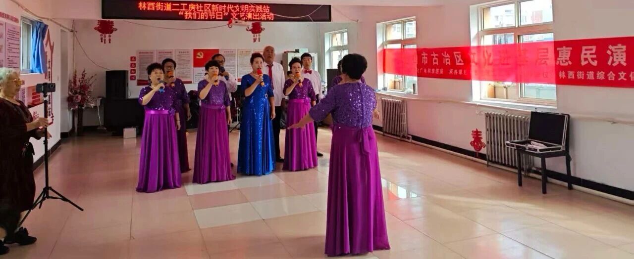 林西街道二工房社区新时代文明实践站联合雷锋之声艺术团,举办 “月满中秋人团圆,国泰民安贺华诞” 文艺汇演。演出以大合唱《我和我的祖国》开场,歌曲、舞蹈、模特走秀等节目轮番上演,《咱老百姓》传递家国祝愿,最终在红歌连唱中落幕,弘扬爱国主义精神,增强社区凝聚力。